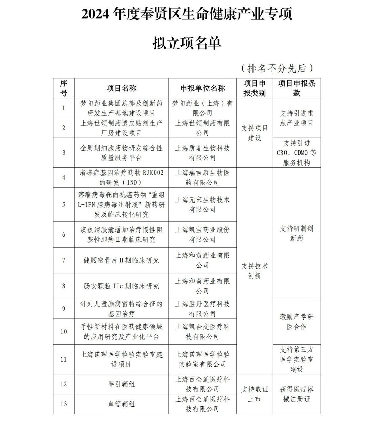 附件:2024年度奉贤区生命健康产业专项拟立项名单