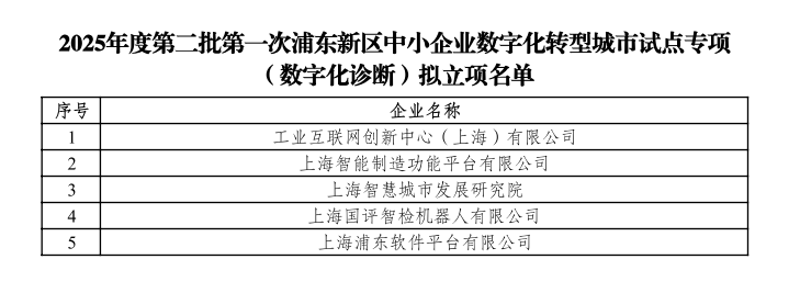 2025年度第二批第一次浦东新区中小企业数字化转型城市试点专项(数字化诊断)拟立项名单的公示