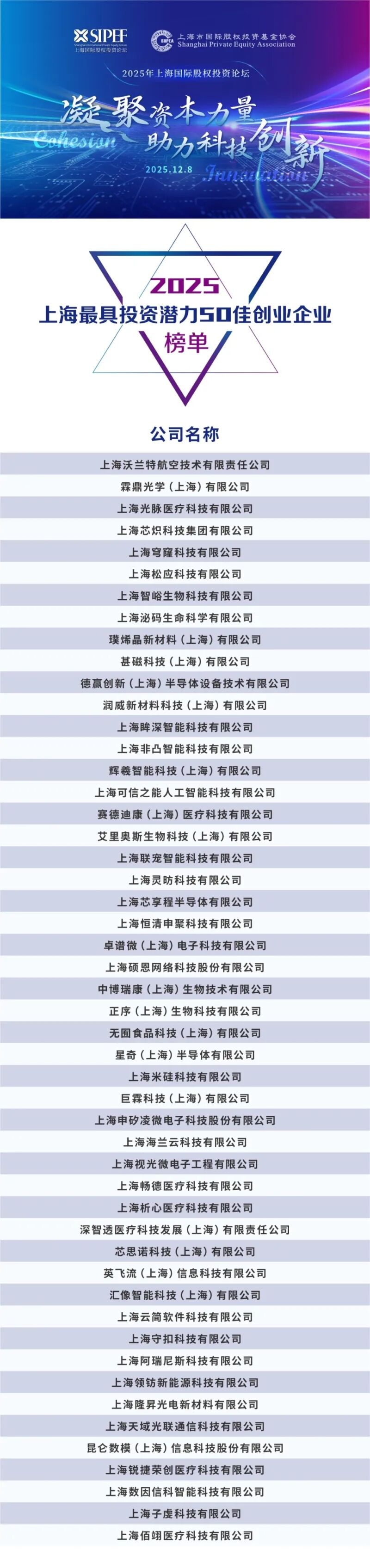 “2025上海最具投资潜力50佳创业企业”榜单揭晓