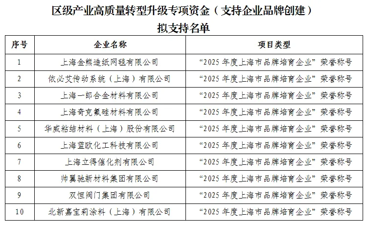 公示| 上海金山区产业高质量转型升级专项资金(支持企业品牌创建)拟支持名单的公示