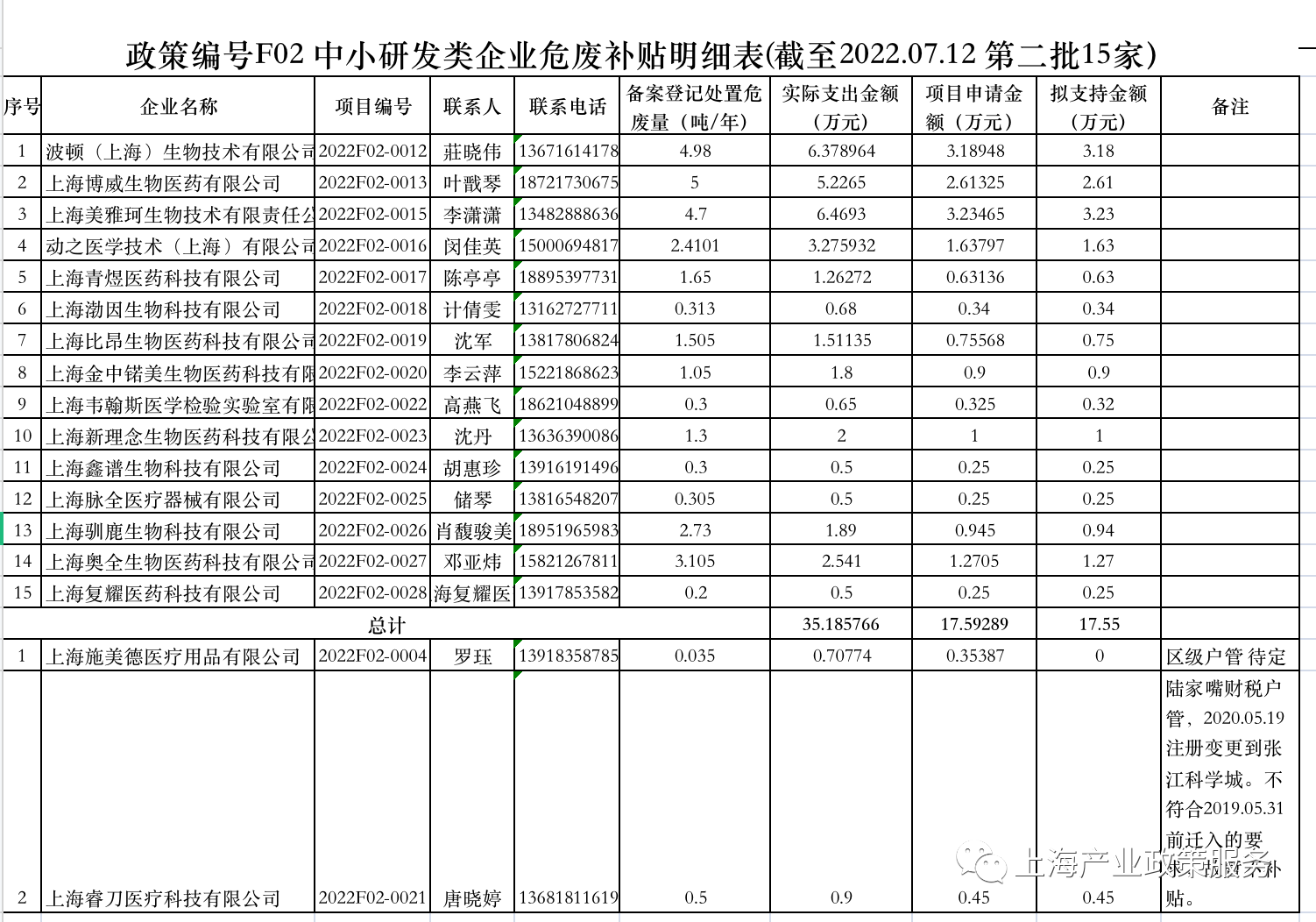 公示|张江科学城专项资金支持 ”中小研发类企业危废处置项目补贴“企业名单(第二批)公示