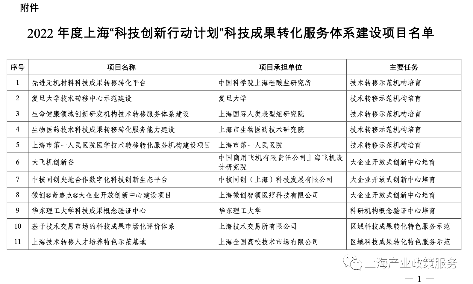 公示|上海市2022年度“科技创新行动计划”科技成果转化服务体系建设项目立项的通知