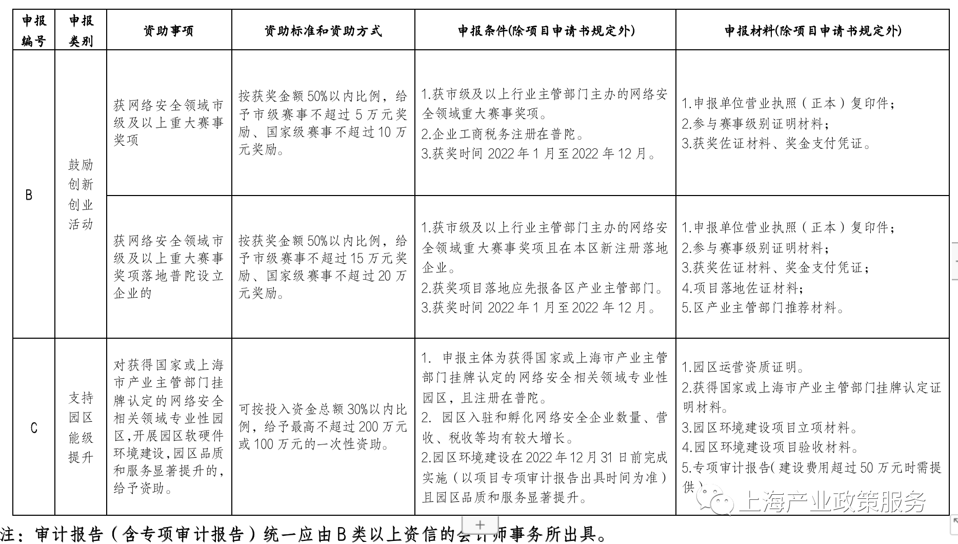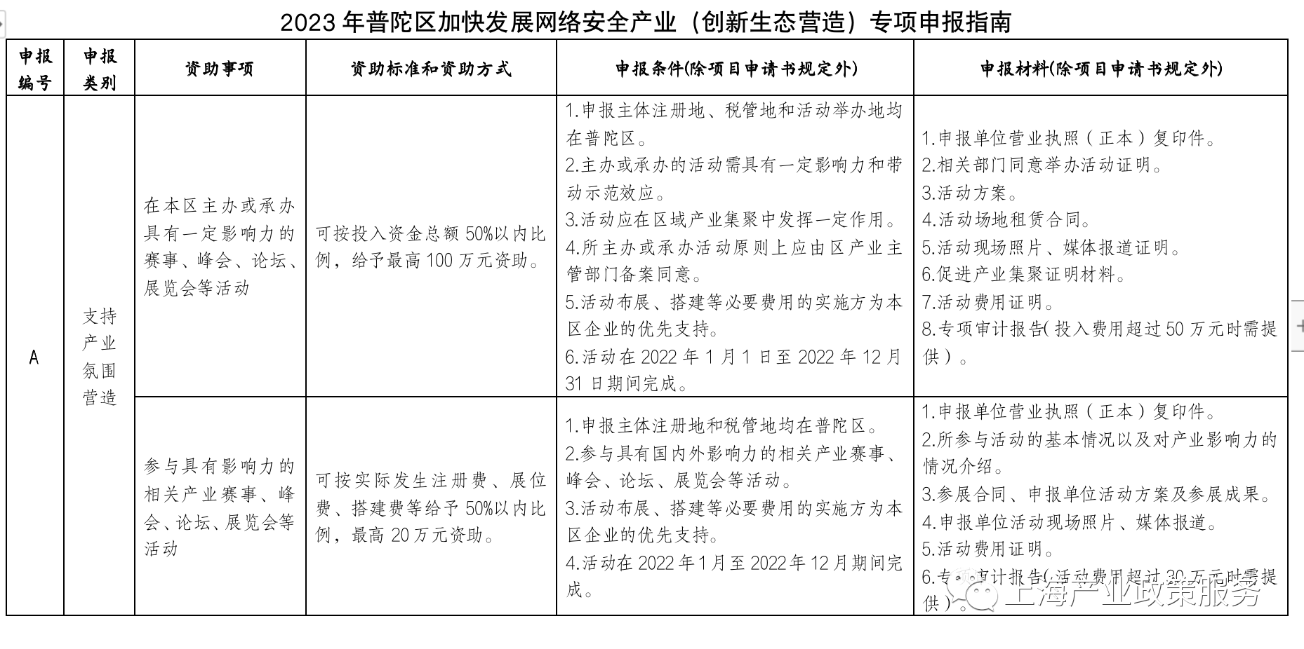 为加快推进网络安全产业发展,建设网络安全创新高地,高标准打造立足本市、辐射长三角的网络安全产业示范园区,依据《普陀区加快发展网络安全产业实施意见》(普科合规范〔2022〕1号)文件精神,现就开展2023年普陀区加快发展网络安全产业(创新生态营造)专项(以下简称“专项”)申报工作的有关事项通知如下: 一、支持范围与扶持方式 在普陀区依法设立,信用记录良好,符合网络安全产业领域发展方向的企业和机构。 该专项扶持项目分为支持产业氛围营造、鼓励创新创业活动、支持园区能级提升三类,具体申报条件、扶持条件参见《2023年度普陀区加快发展网络安全产业(创新生态营造)专项申报指南》(以下简称《申报指南》,附件1)。