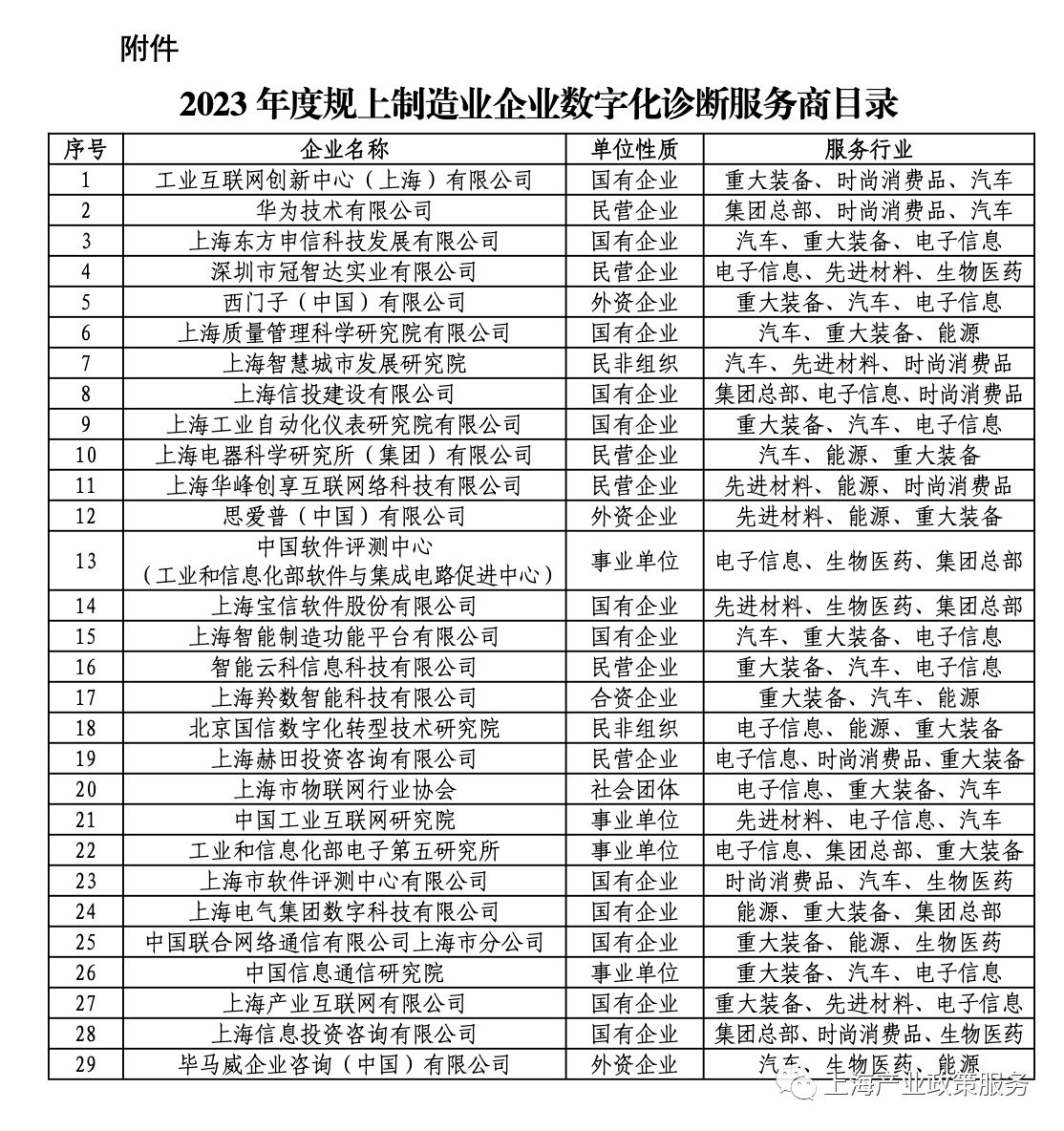 公告|上海市2023年度规上制造业企业数字化诊断服务商目录的通知